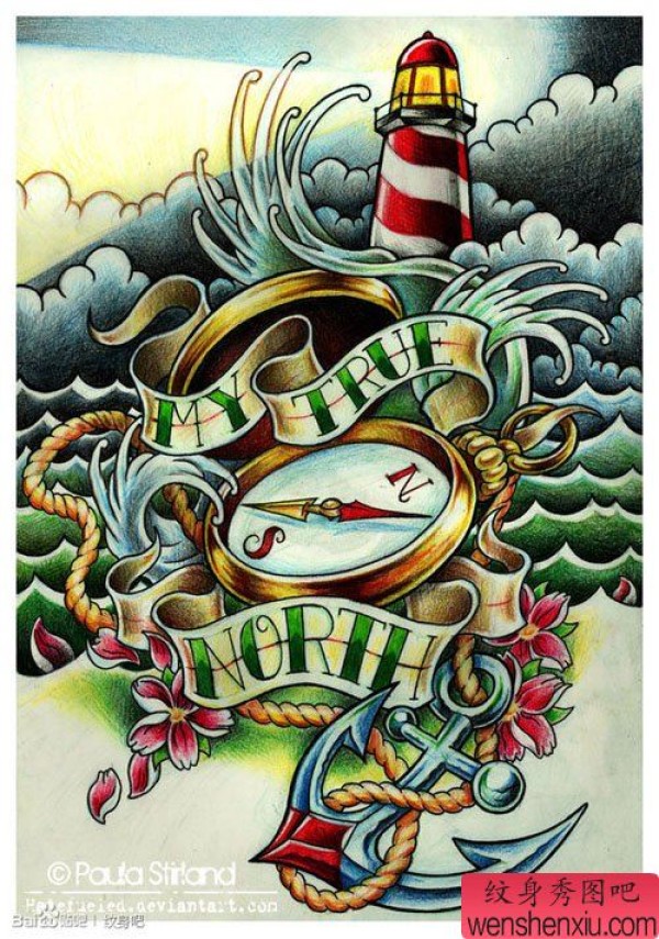 一张时尚经典的灯塔船锚指南针纹身手稿