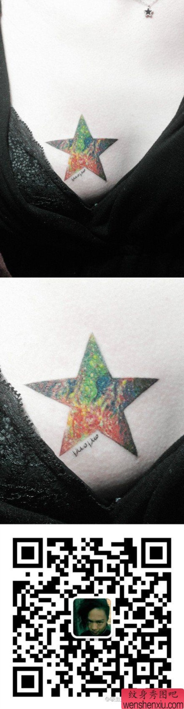 女生胸部一张精美的彩色星空五角星纹身图案