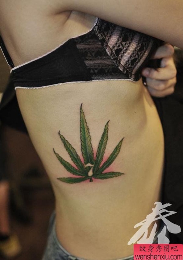 分享美女侧侧腰上的一张桑叶纹身作品