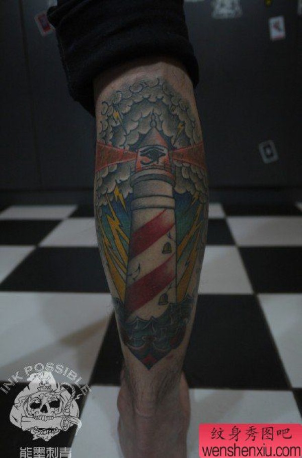 腿部时尚时尚的一张灯塔纹身图案