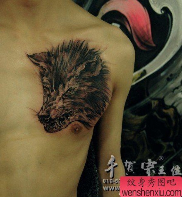 男生胸前一张很帅凶悍的狼头纹身图案
