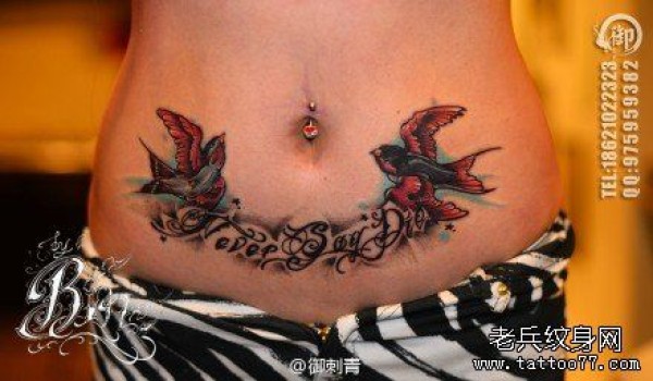 女生腹部时尚时尚的燕子与字母纹身图案