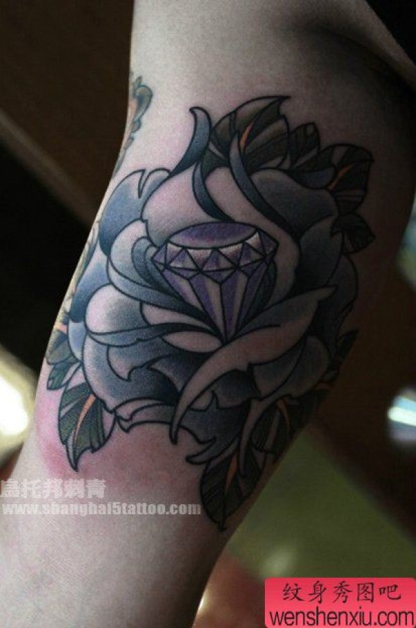 手臂内侧时尚精美的钻石与玫瑰纹身图案