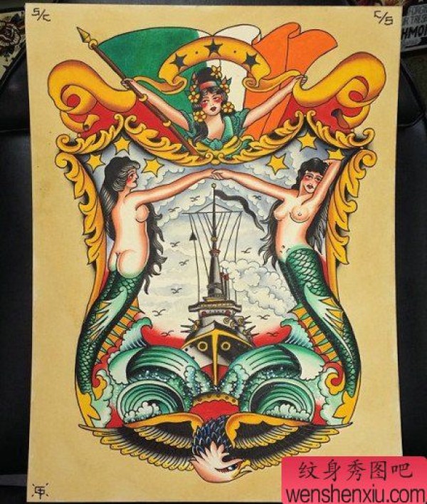 时尚经典的一张满背轮船美人鱼纹身手稿