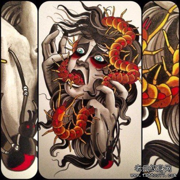 很酷时尚的一张美女与蜈蚣纹身手稿