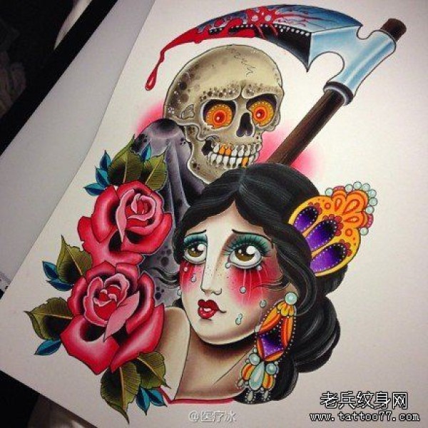 时尚漂亮的school风格的骷髅与美女纹身图案