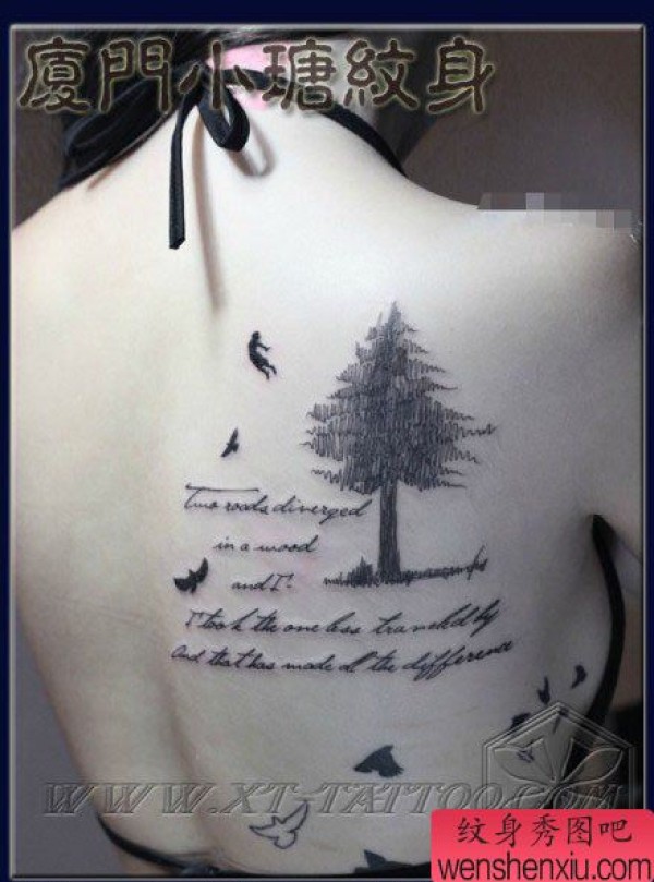 女生背部时尚时尚的小树与小鸟纹身图案