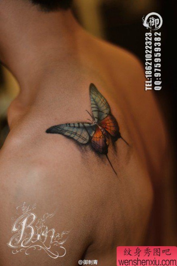 男生后肩背漂亮唯美的蝴蝶纹身图案
