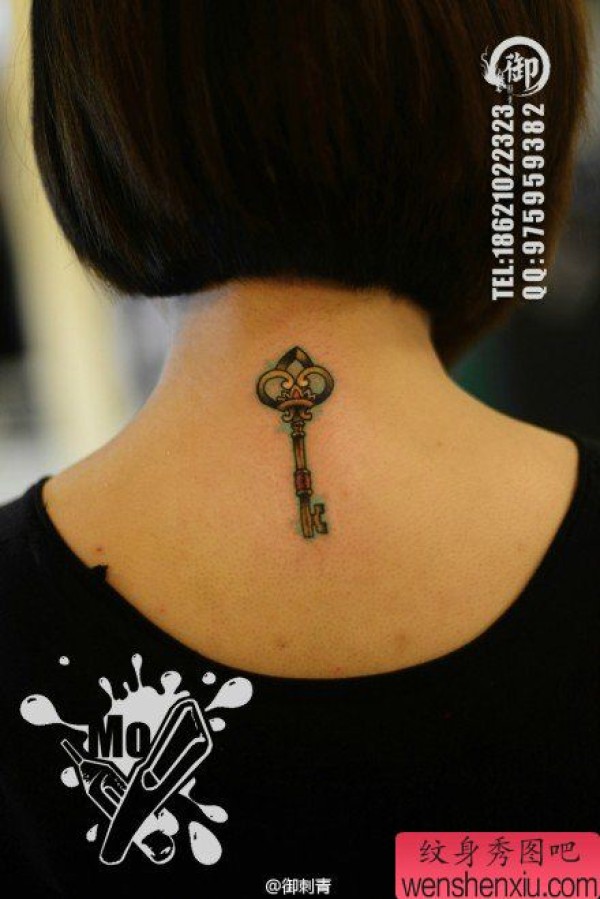 女生后脖子小巧时尚的钥匙纹身图案
