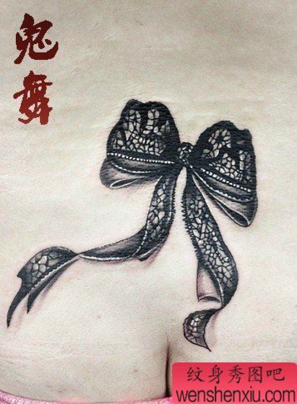 美女腰部小巧精美的蕾丝蝴蝶结纹身图案