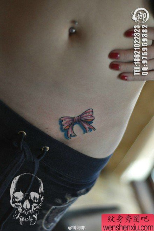 女生腹部时尚小巧的蝴蝶结纹身图案
