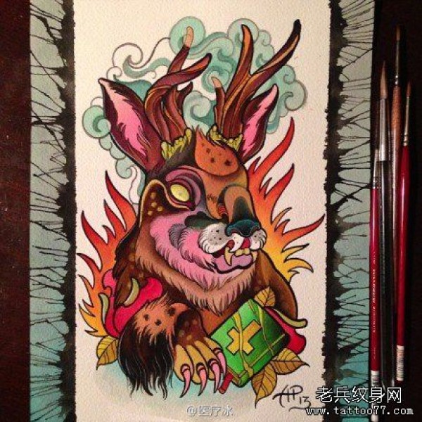 时尚很帅的一张长鹿角的兔子纹身图案
