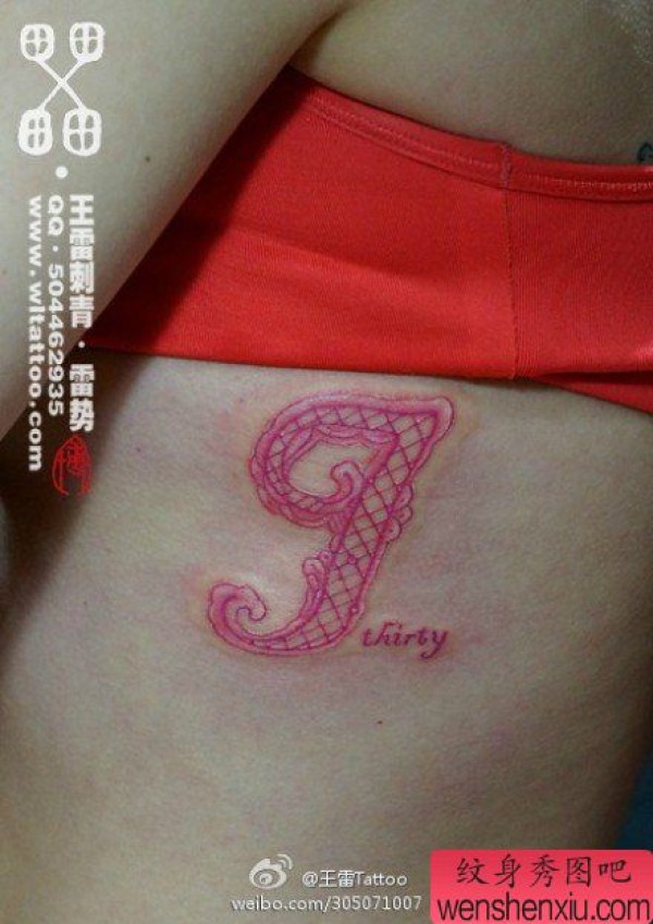 美女侧胸时尚精美的蕾丝字母纹身图案