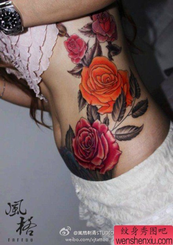 美女腹部到腰部好看唯美的玫瑰花纹身图案