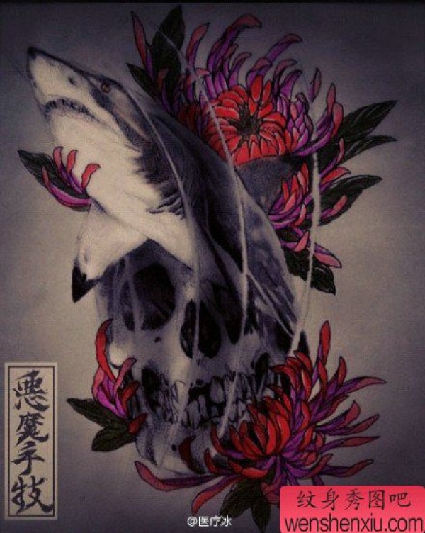 时尚很帅的一张骷髅与鲨鱼纹身手稿