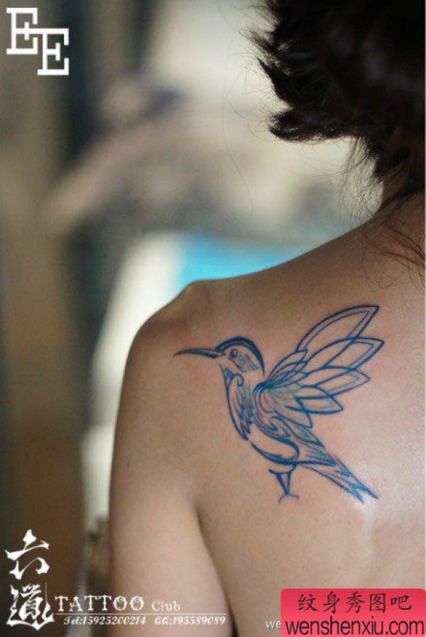 女生肩背时尚时尚的图腾蜂鸟纹身图案