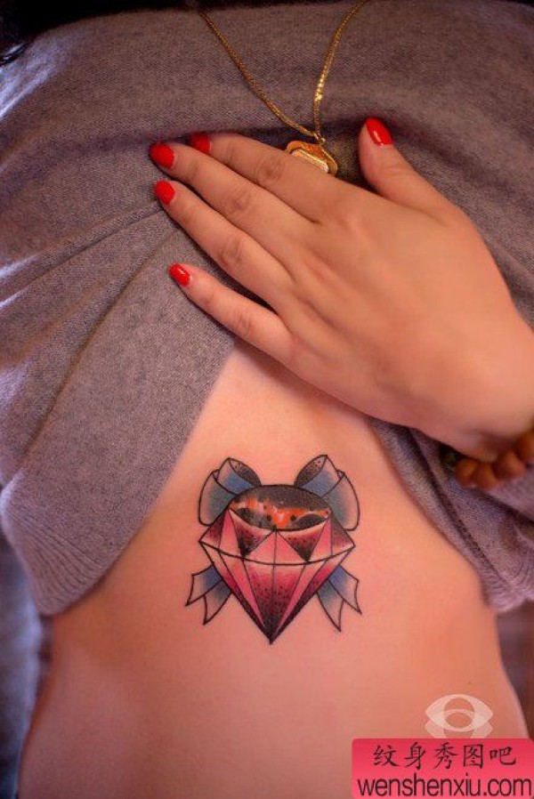 美女腹部精美的彩色钻石纹身图案