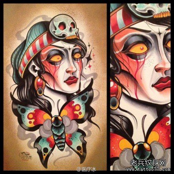 时尚漂亮的欧美美女与蛾子纹身手稿