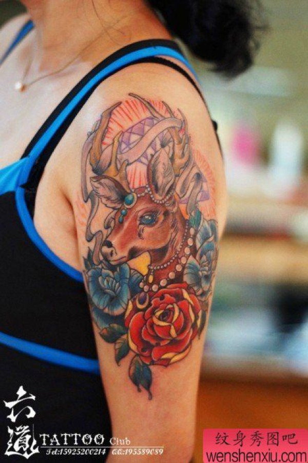手臂时尚经典的一张彩色鹿纹身图案