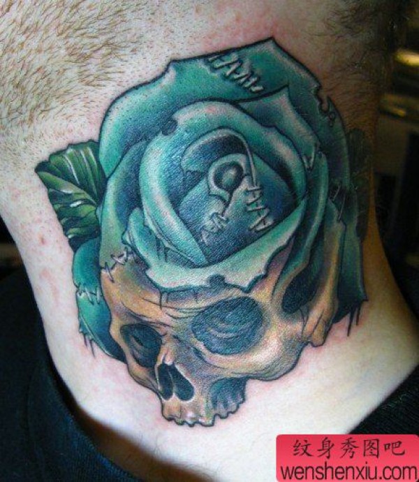 男生脖子处时尚经典的玫瑰骷髅纹身图案