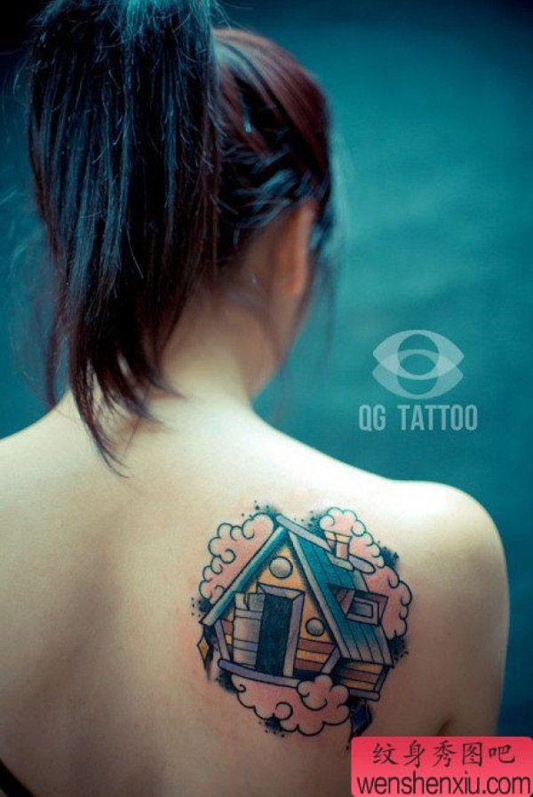 女生肩背好看经典的小木屋纹身图案