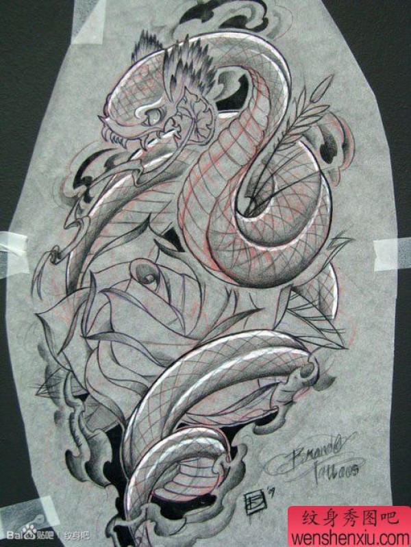 时尚很帅的一张蛇玫瑰花纹身手稿