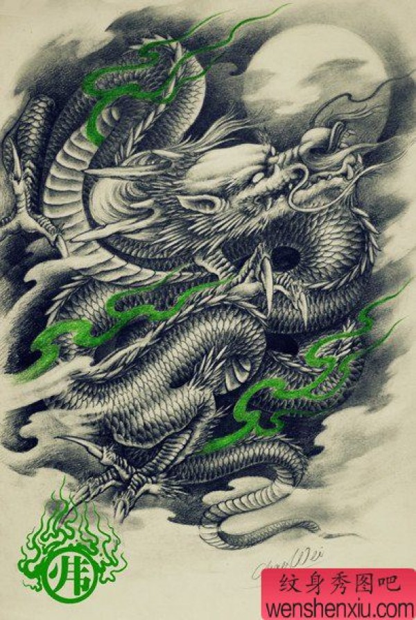 龙纹身手稿_一组老传统黑灰龙手稿纹身图案