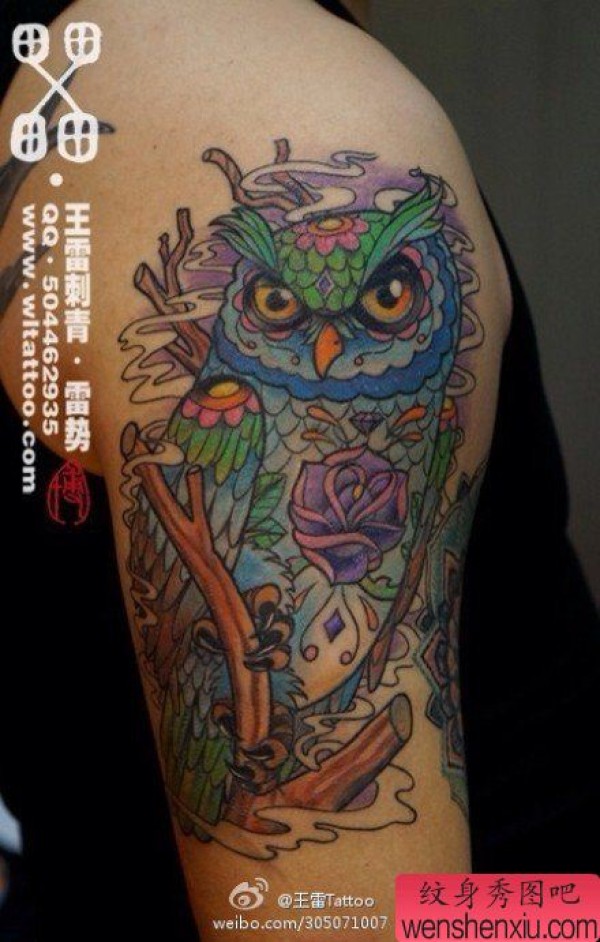 手臂时尚很帅的彩色猫头鹰纹身图案