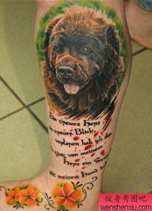 小腿上一张可爱小狗纹身图案