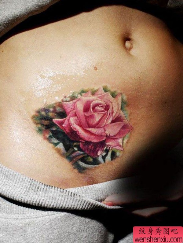 美女腹部精美写实的彩色玫瑰花纹身图案