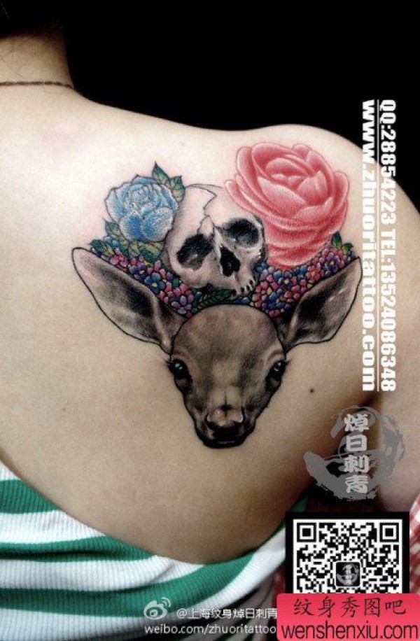 美女肩背唯美时尚的小鹿骷髅纹身图案