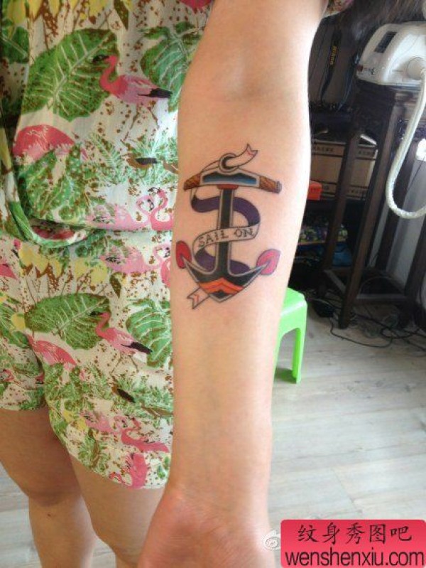 女生手臂唯美好看的船锚纹身图案
