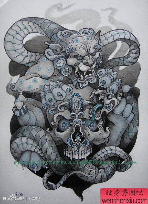 时尚帅气的一张唐狮子与嘎巴拉纹身图案