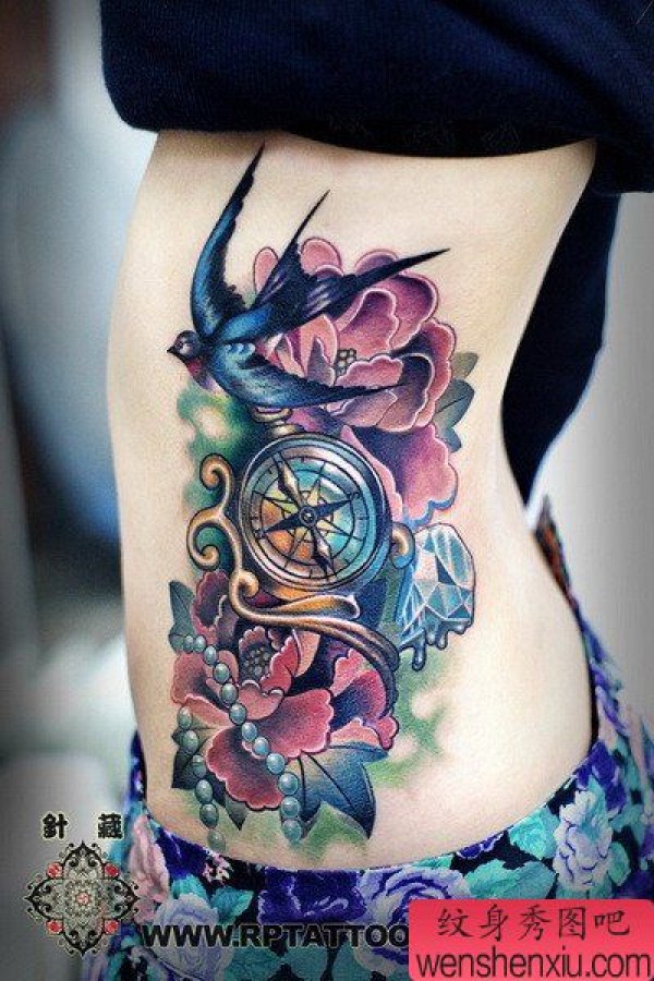 美女腰部时尚唯美的指南针燕子牡丹钻石纹身图案