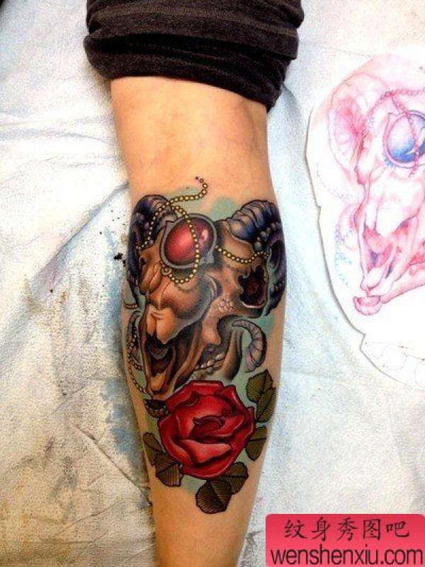 腿部时尚时尚的羊头骷髅纹身图案