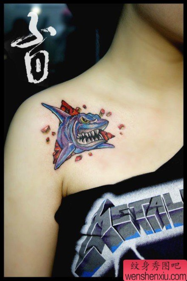 女生肩膀处经典很酷的鲨鱼纹身图案