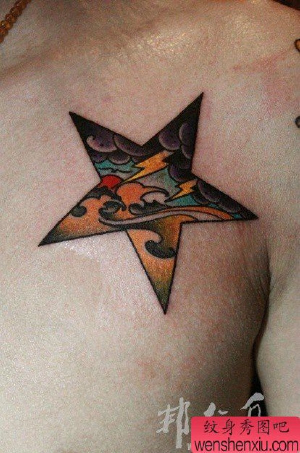 男士胸前时尚的五角星乌云闪电纹身图案