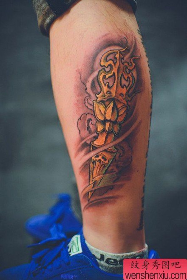 腿部时尚很酷的一张降魔杵纹身图案