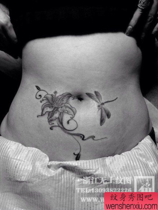 女生腹部时尚的黑白百合花与蜻蜓纹身图案
