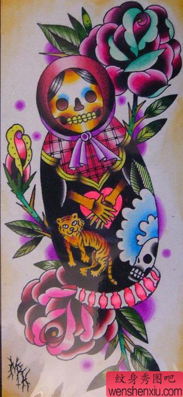 时尚经典的一张不倒翁玫瑰花纹身手稿