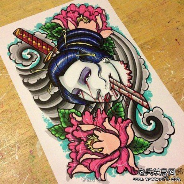 一张另类很酷的艺妓纹身图案