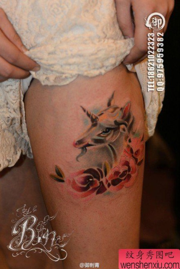美女腿部唯美好看的独角兽纹身图案