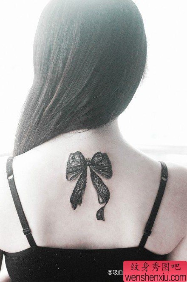 女生后背唯美时尚的蕾丝蝴蝶结纹身图案