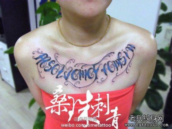 女生胸前经典时尚的花体字母纹身图案