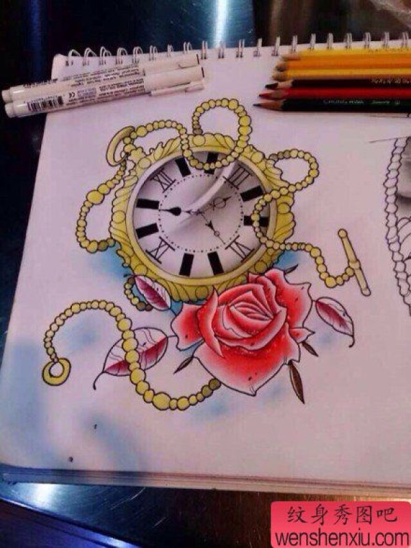 时尚时尚的一张怀表玫瑰花纹身手稿