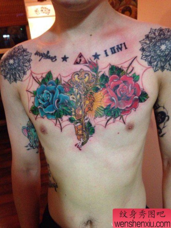 前胸经典唯美的一张钥匙与玫瑰纹身图案