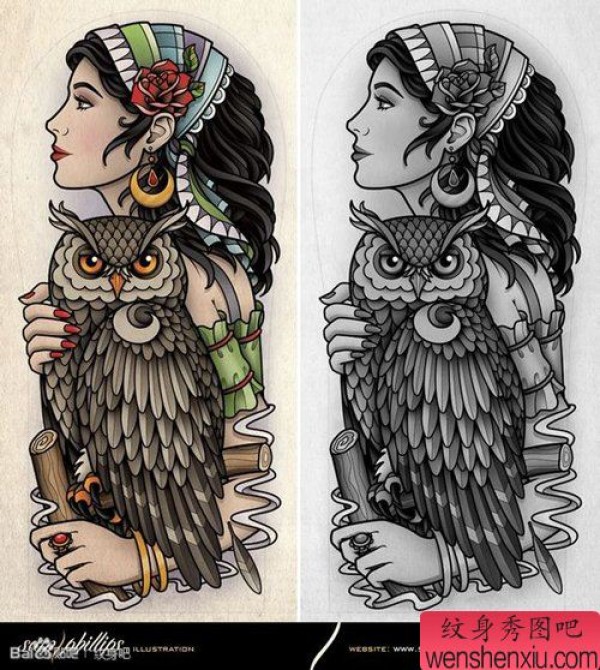 一张超酷漂亮的school美女与猫头鹰纹身图案