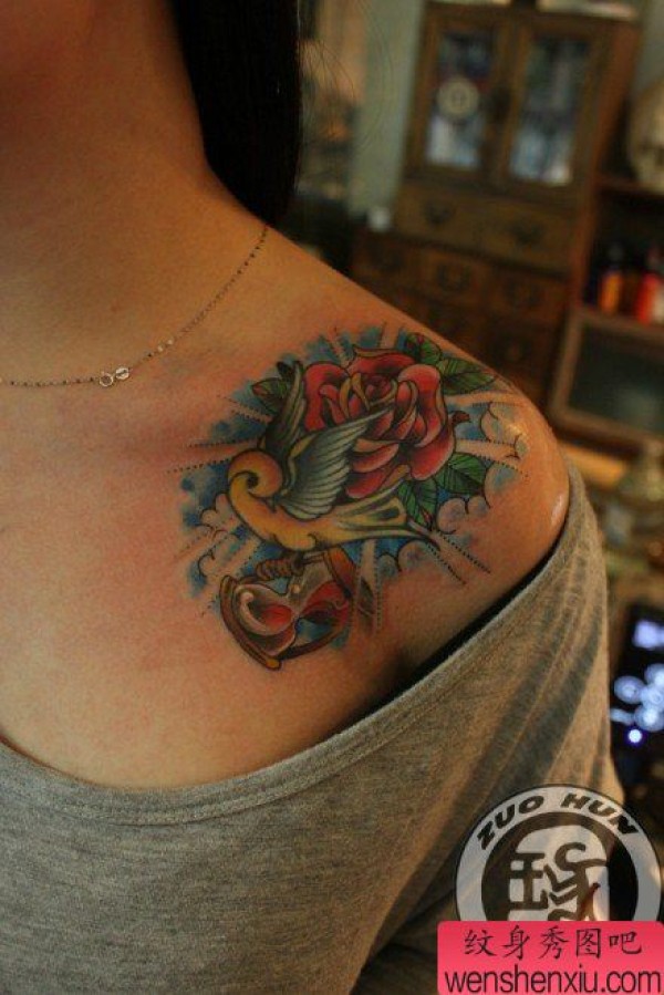 女生肩膀处精美时尚的小燕子与玫瑰花纹身图案