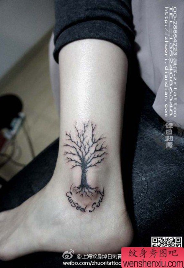 女生脚踝处时尚时尚的小树纹身图案