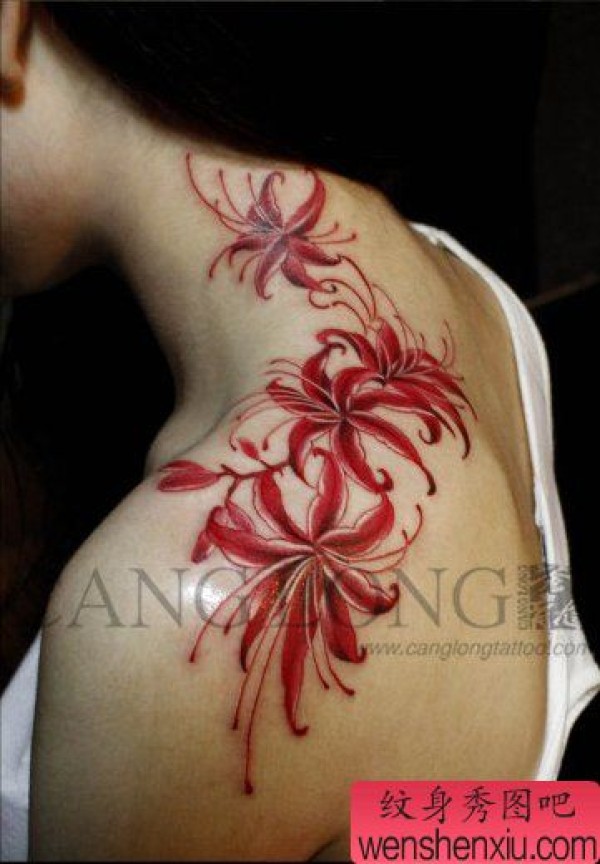 女生肩膀处时尚精美的彼岸花纹身图案